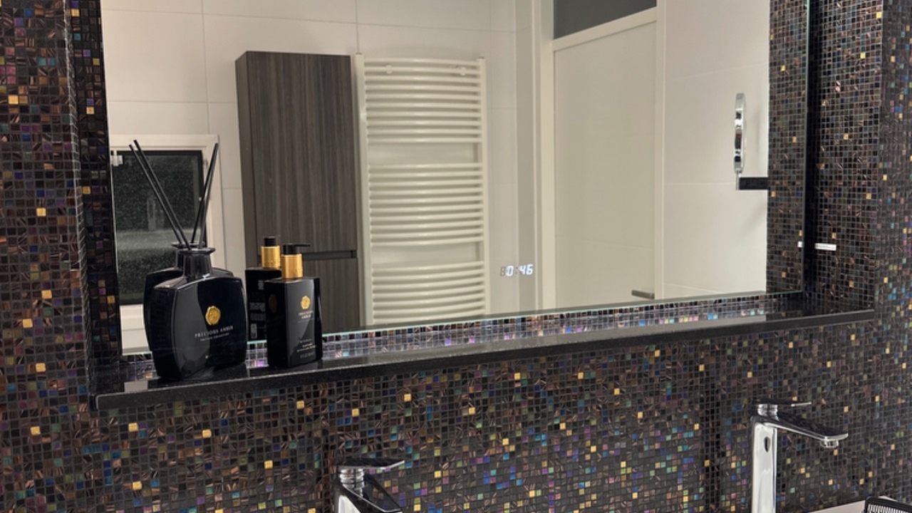 Mooie grote spiegel die makkelijk in gebruik is. De klok onderin is een welkome aanvulling voor ons als gezin met 5 (jong-) volwassenen waarbij het 's ochtends en 's avonds vaak 'douche file' is omdat iedereen op tijd weg moet...