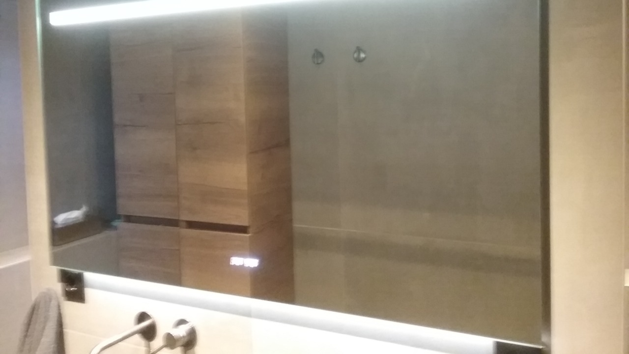 Mooie strakke spiegel met een fijne licht bediening en een duidelijke maar niet te opvallende klok.