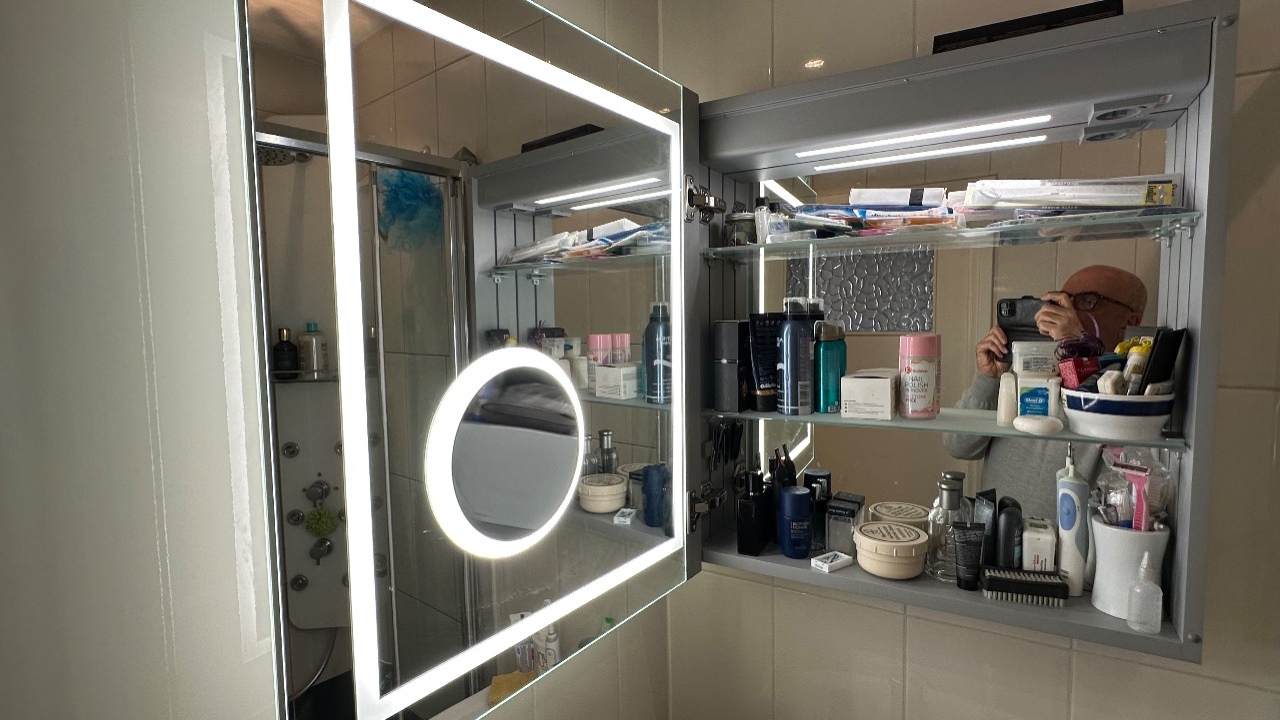 Wat een mooie spiegel, of beter: 4 spiegels. Voorzijde deur, achterzijde deur, achterwand kast en ook nog een scheerspiegel (mèt eigen verlichting!). Inrichting kast mooi, met finishing touch van magneethouder (fijn voor schaartje e.d.).