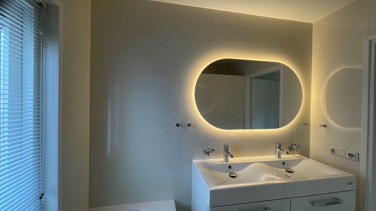 L'éclairage LED de ce miroir de salle de bain ovale brille joliment sur le mur par derrière. L'éclairage est dimmable et la couleur de la lumière peut être réglée selon vos préférences.