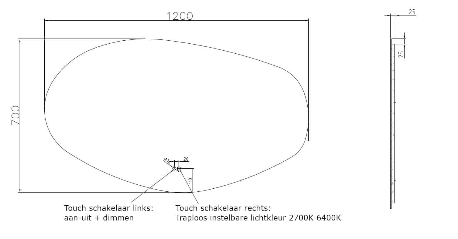 Deze trendy badkamer spiegel met organische vorm is 120 cm breed, 70 cm hoog en slechts 3 cm diep
