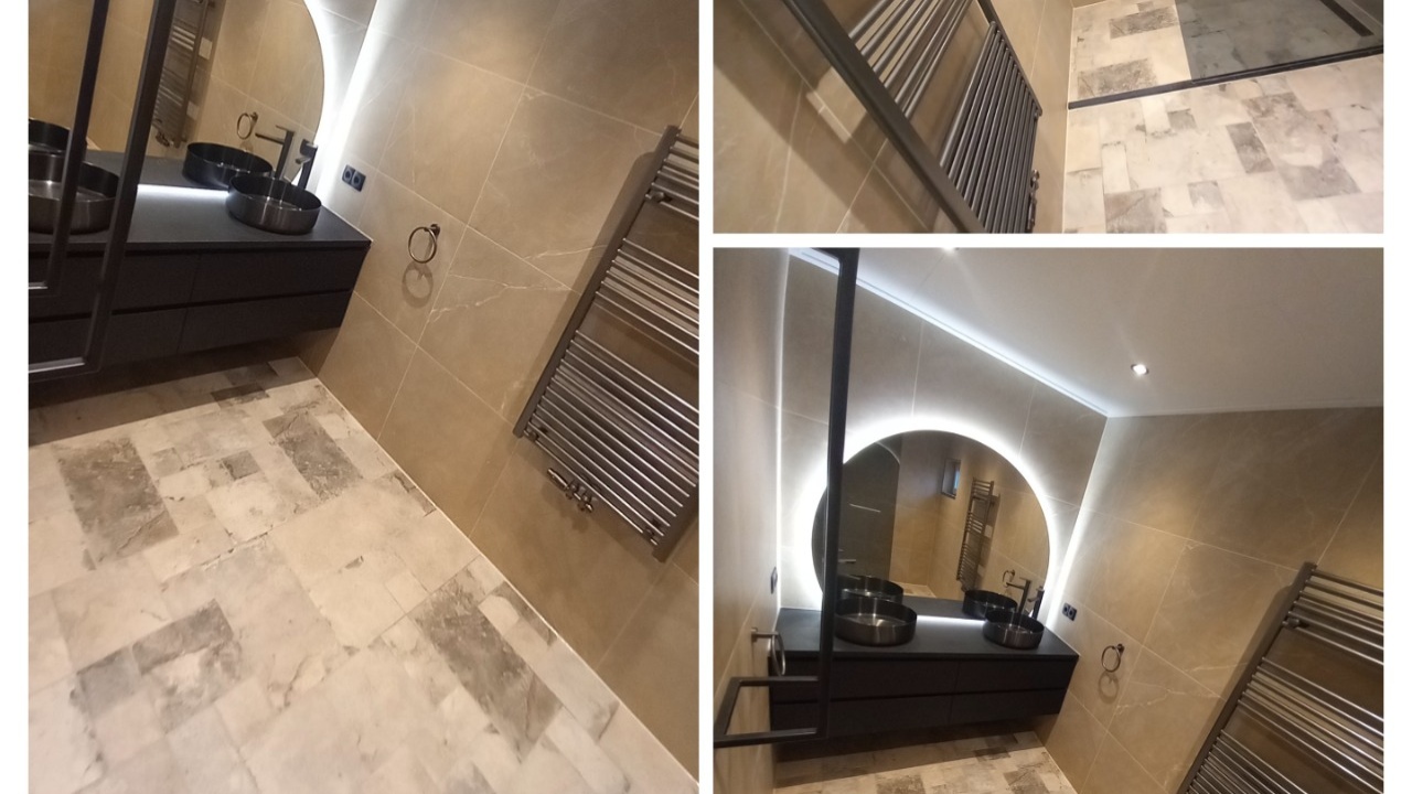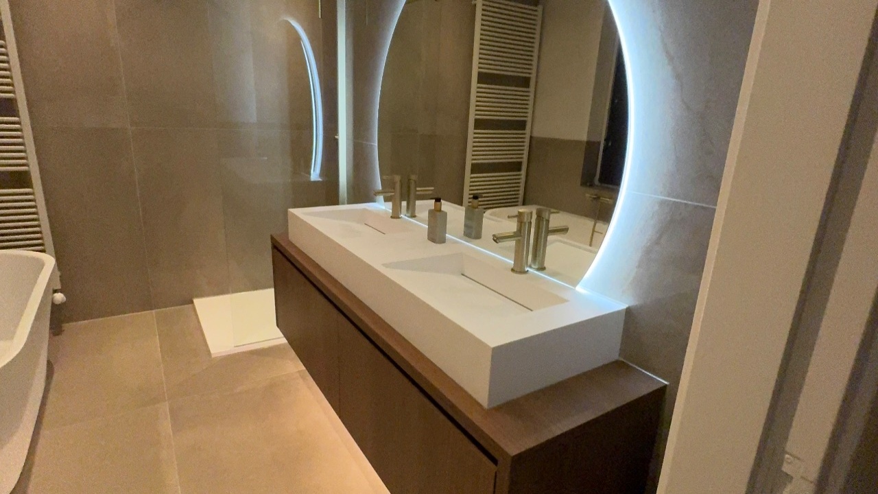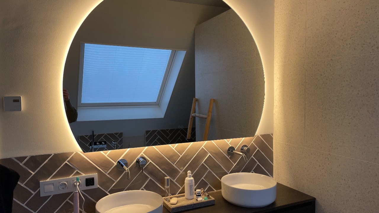 De indirecte verlichting schijnt vanachter de spiegel fraai en sfeervol rondom over de wand. Hierdoor is de verlichting praktisch in gebruik en zorgt het daarnaast voor veel sfeer in de badkamer.