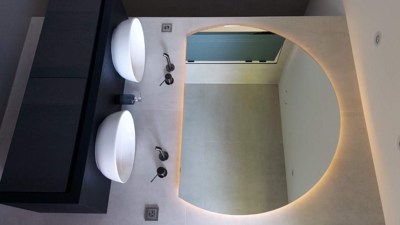 Deze halfronde badkamer spiegel kan zowel op het meubel als zwevend boven het meubel worden geplaatst