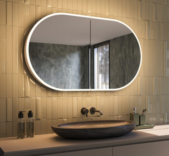 Directe verlichting aan de voorzijde van de spiegelkast deuren. Stijlvol tegen de spiegelrand geplaatst. Dit type verlichting zorgt voor functioneel licht in het gezicht, bv bij het scheren of make-uppen |