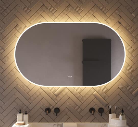 Deze trendy ovale spiegel voor in de badkamer is van alle gemakken voorzien, zoals: geïntegreerde verlichting en verwarming, dimfunctie, instelbare lichtkleur en dubbele touch bediening