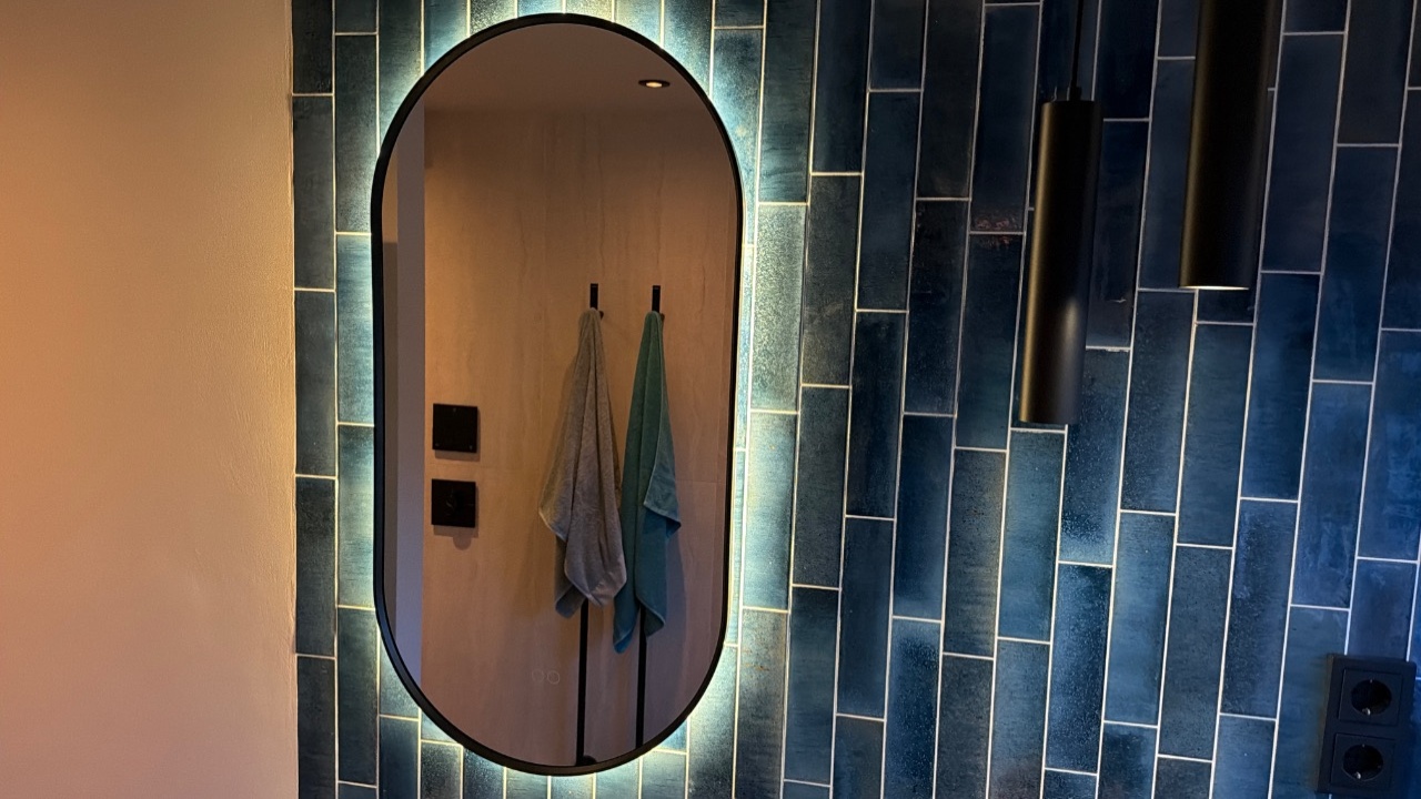 De LED verlichting is bij deze ovale badkamer spiegel met zwart frame rondom geplaatst en schijnt vanachter de spiegel sfeervol over de wand.